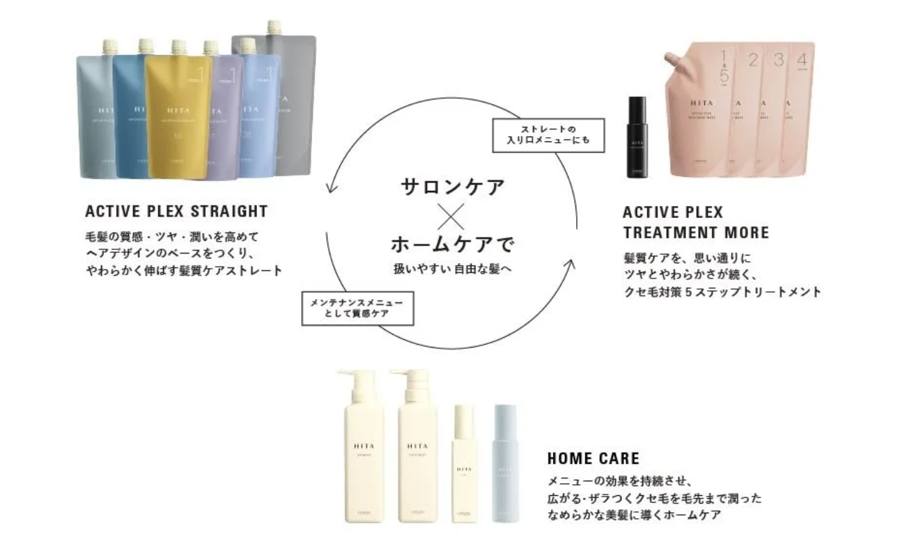 HITAは、サロンメニュー(APストレート・APトリートメントモア)とホームケアの3つのラインで構成。